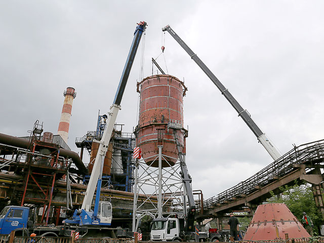 Скруббер, дроссельная группа и каплеуловитель будут размещены на существующем фундаменте первой очереди сухой газоочистки. В данный момент на фундамент сухой газоочистки доменного газа установлены опорные конструкции скруббера и смонтированы два первых укрупненных узла. Основные металлоконструкции имеются в наличии. Прибыла на завод первая партия газоходов. Изготавливаются площадки обслуживания, лестницы и запорная арматура.